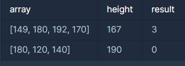 머쓱이는 학교에서 키 순으로 줄을 설 때 몇 번째로 서야 하는지 궁금해졌습니다. 머쓱이네 반 친구들의 키가 담긴 정수 배열 array와 머쓱이의 키 height가 매개변수로 주어질 때, 머쓱이보다 키 큰 사람 수를 return 하도록 solution 함수를 완성해보세요.