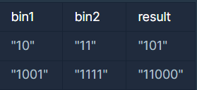 이진수를 의미하는 두 개의 문자열 bin1과 bin2가 매개변수로 주어질 때, 두 이진수의 합을 return하도록 solution 함수를 완성해주세요.
