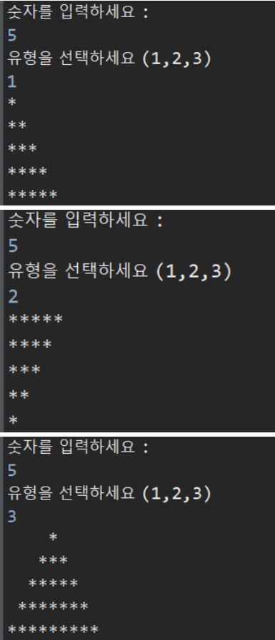 순서대로 출력, 거꾸로 출력, 피라미드 모양으로 출력 3가지 중 무엇으로 할지 유형 선택도 받았다.